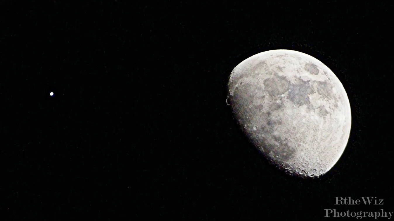 The small dot to the left of the moon is actually Jupiter appearing close. the moon is q quarter of the size of earth and Jupiter is more than 1300 times the volume of earth, Perspective.