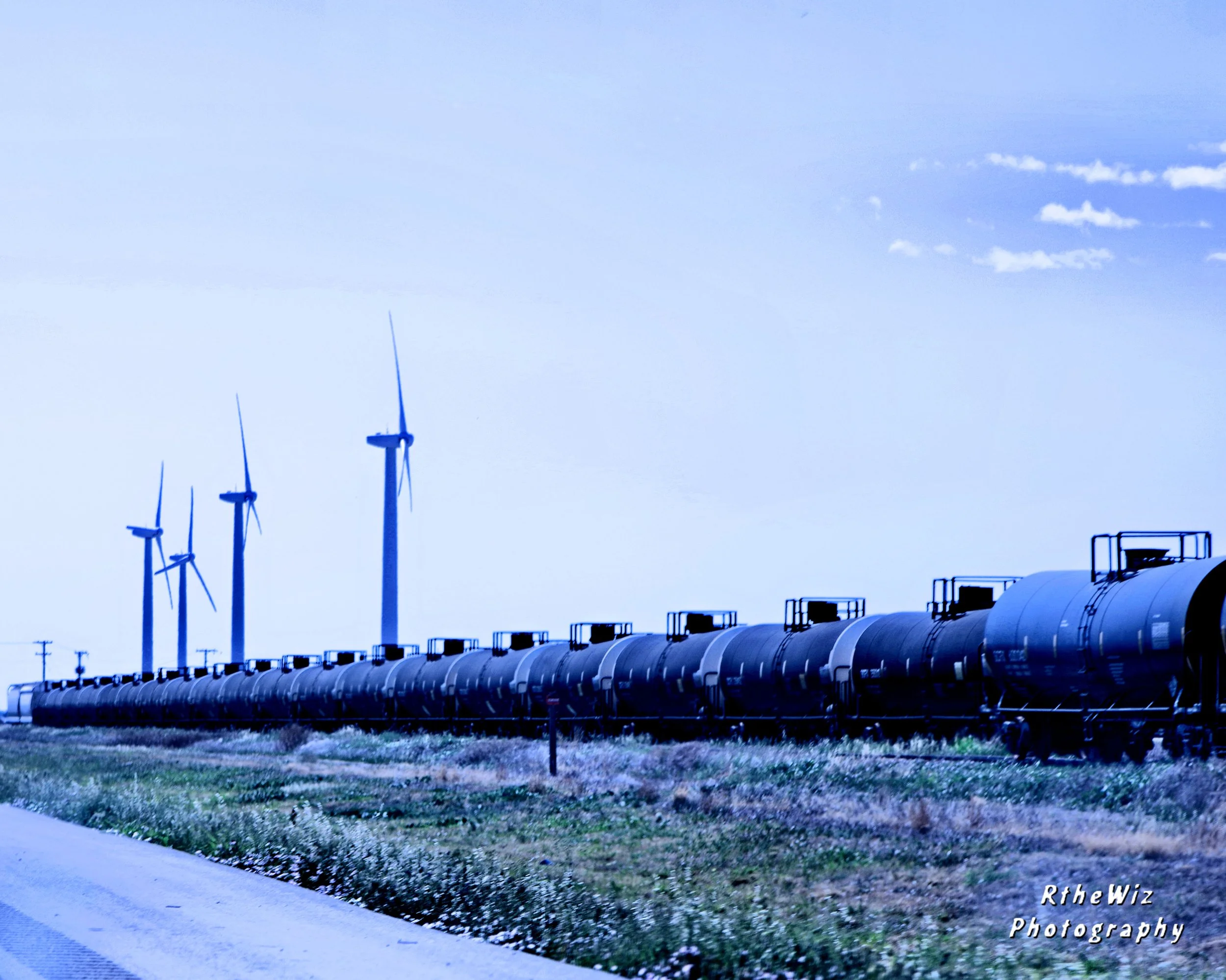 Oil tank cars, parked in front of giant wind turbines.